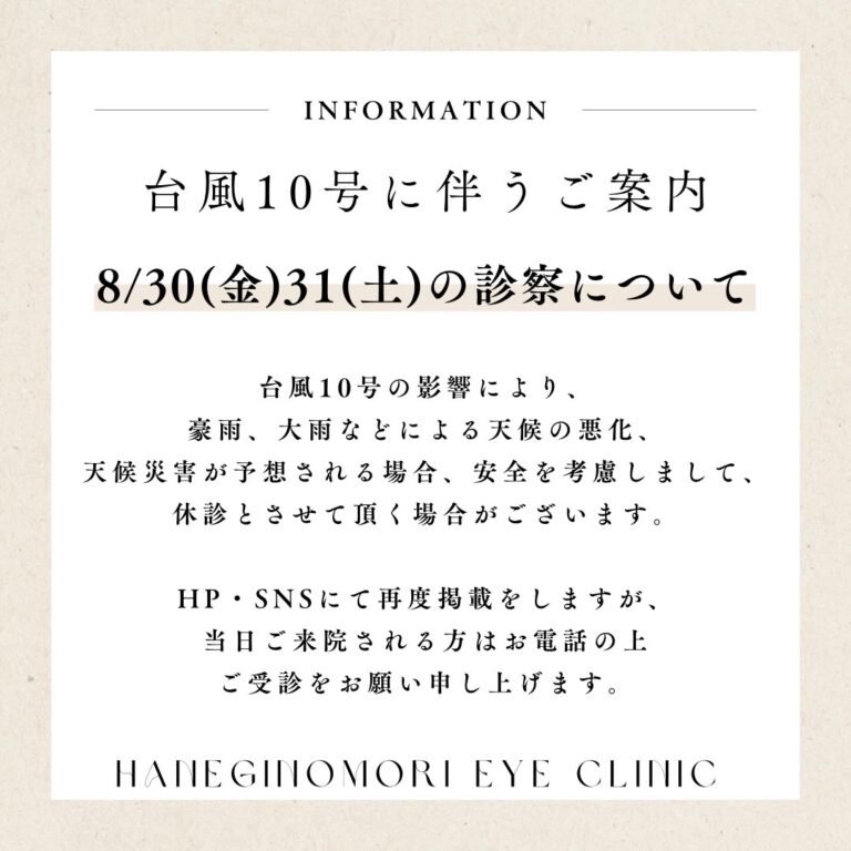 明日の台風の影響、もしくは交通機関への影響で、診療開始時間が大幅に遅れる可能性がございます。午前中診療をご希望の方はお手数ですが、一度お電話頂いた上でのご来院をお願いいたします。